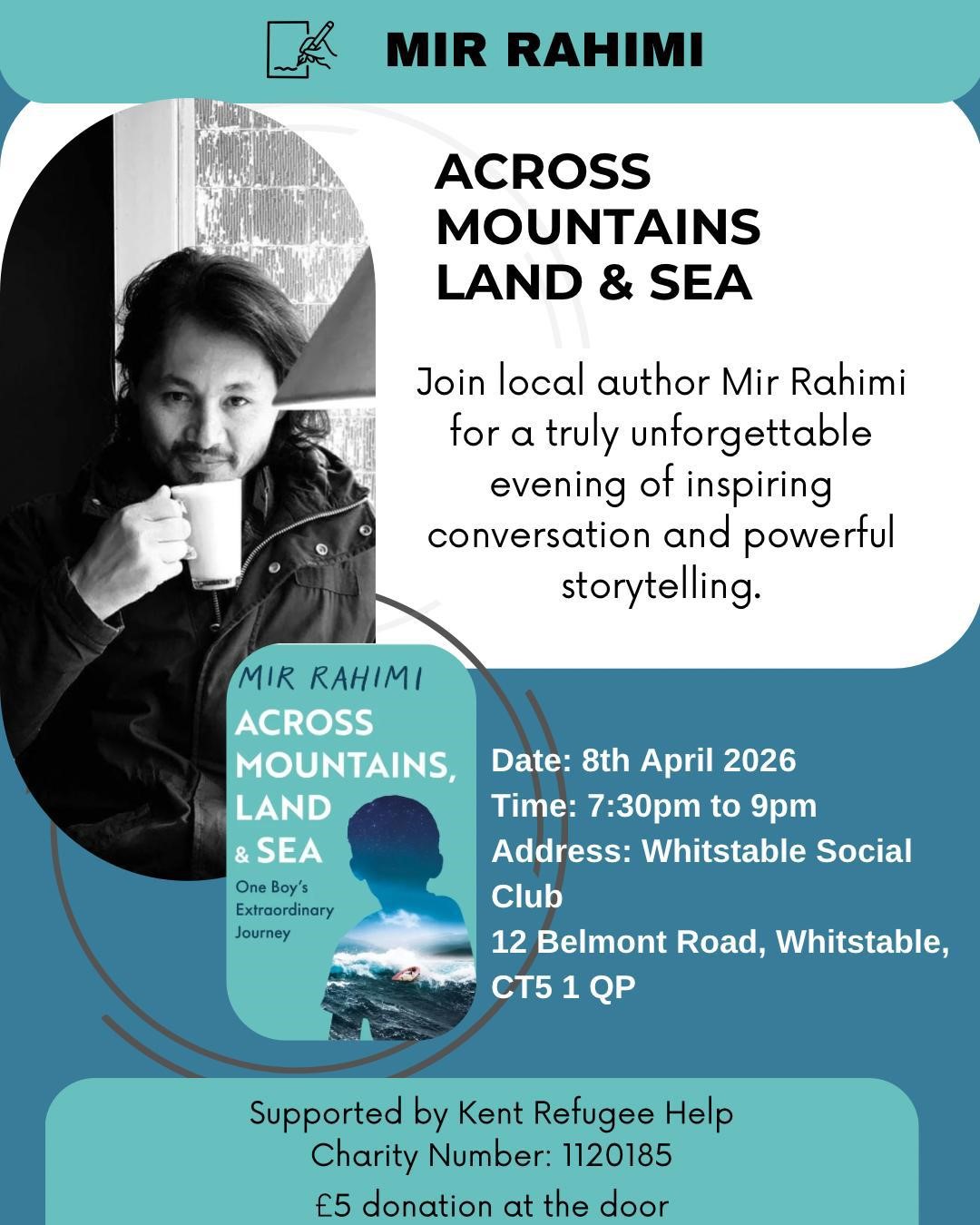 Local author, Mir Rahimi, will be speaking about his book, Across Mountains, Land and Sea on Wednesday, 8th April at Whitstable Social Club at 7.30 pm to 9.00 pm. Please see the attached flyer. Mir’s book documents his incredible journey from Afghanistan to the UK as a lone child refugee and his subsequent work for the UN. His book signing event at Faversham Literary Festival sold out.